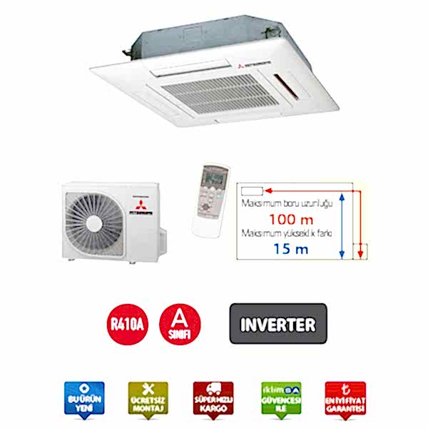 Mitsubishi’den İklimsa güvencesinde, 42560 Btu/h soğutma ve 47768 Btu/h ısıtma kapasitesi ile çalışan, R410A gazlı FDT 125 VNVF inverter Mitsubishi İnverter Kaset Tipi Klima.