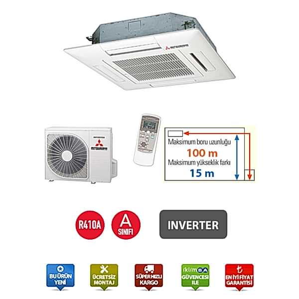 Mitsubishi’den İklimsa güvencesinde, 24225 Btu/h soğutma ve 27296 Btu/h ısıtma kapasitesi ile çalışan FDT 71 ZJXVF inverter,R410A gazlı Mitsubishi kaset tipi klima.
